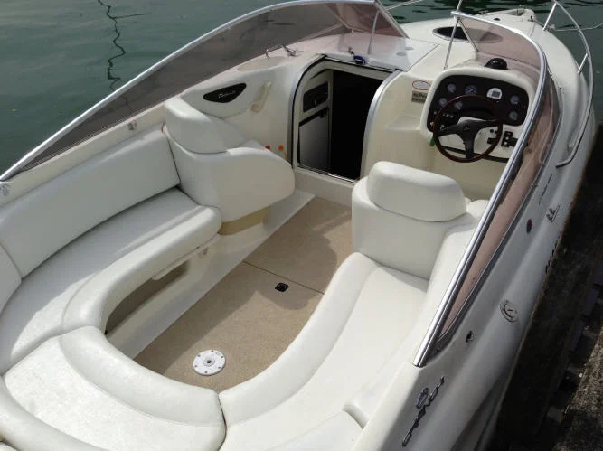 Cranchi Turchese 760, Modernes Sportboot, 8 Zylinder, 5.8 Injection (Geringer Spritverbrauch), 7 Plätze, mit Sonnenverdeck komplettes Regenverdeck mit Kühlschrank und Bluetooth Radio.
